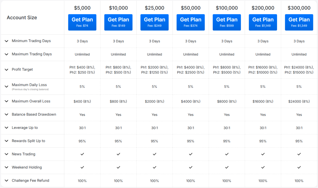 - Profit Target – Traders must achieve a designated profit percentage to successfully conclude an evaluation phase, withdraw earnings, or scale their trading account. The profit target for Phase 1 is set at 8%, whereas Phase 2 requires reaching a profit target of 5%. Funded accounts do not have any specified profit targets.